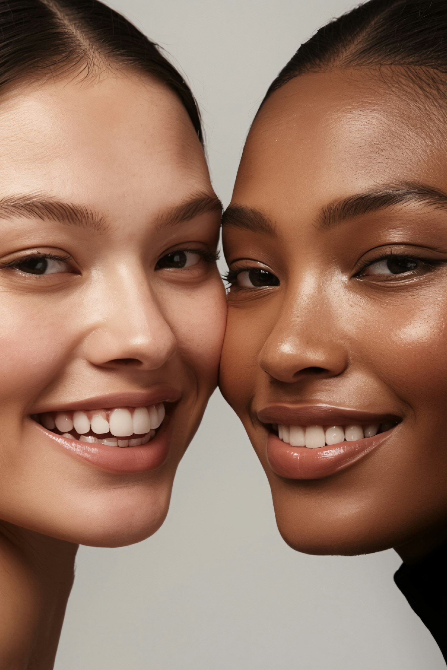 Close-up of two individuals smiling warmly, showcasing their glowing skin and friendly connection against a neutral background.