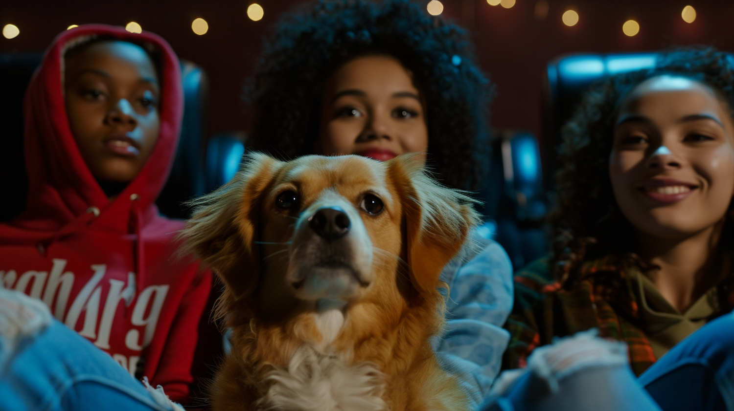 Three young women and a dog enjoy a cozy moment together, surrounded by warm lights and smiles.