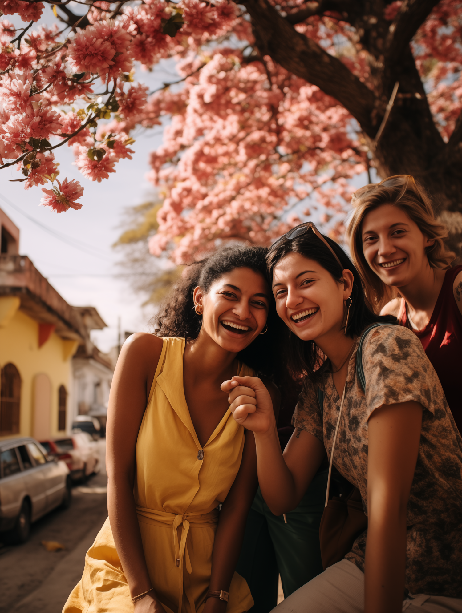 Three women laughing under a pink blossom tree, capturing a joyful moment on a sunny street.