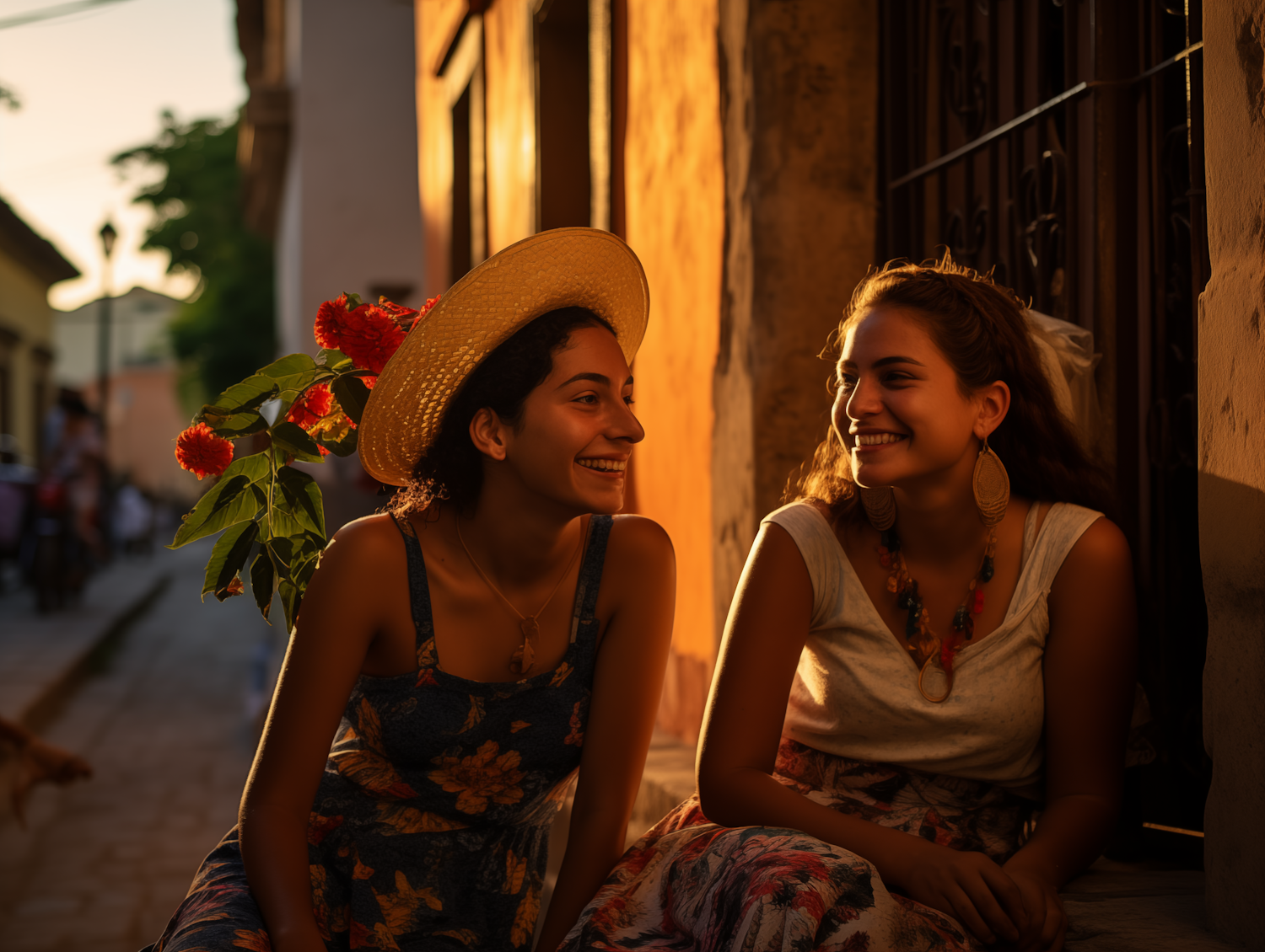 Two women share a joyful moment on a sunlit street, surrounded by vibrant flowers and warm golden light.