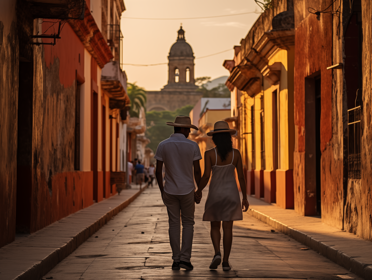 Couple walking hand in hand down a sunlit cobblestone street with colorful buildings and a historic church in the background.