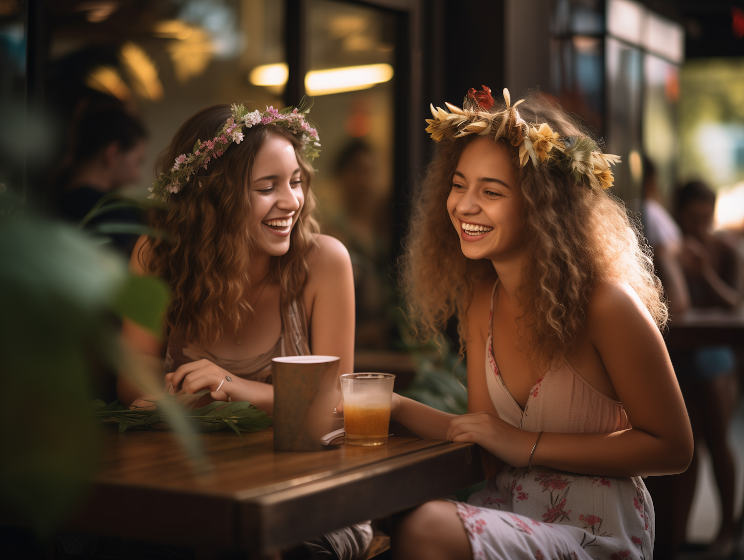 Two women with flower crowns share a joyful moment at an outdoor cafe, laughing and enjoying drinks in a sunlit setting.