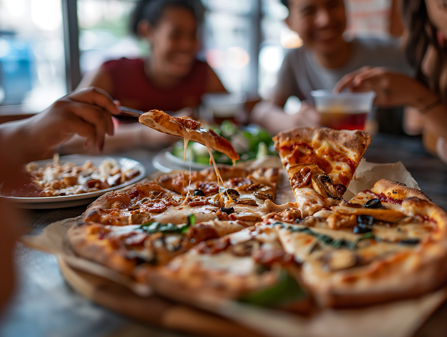 A group of friends enjoying a delicious pizza with various toppings in a cozy, relaxed setting.