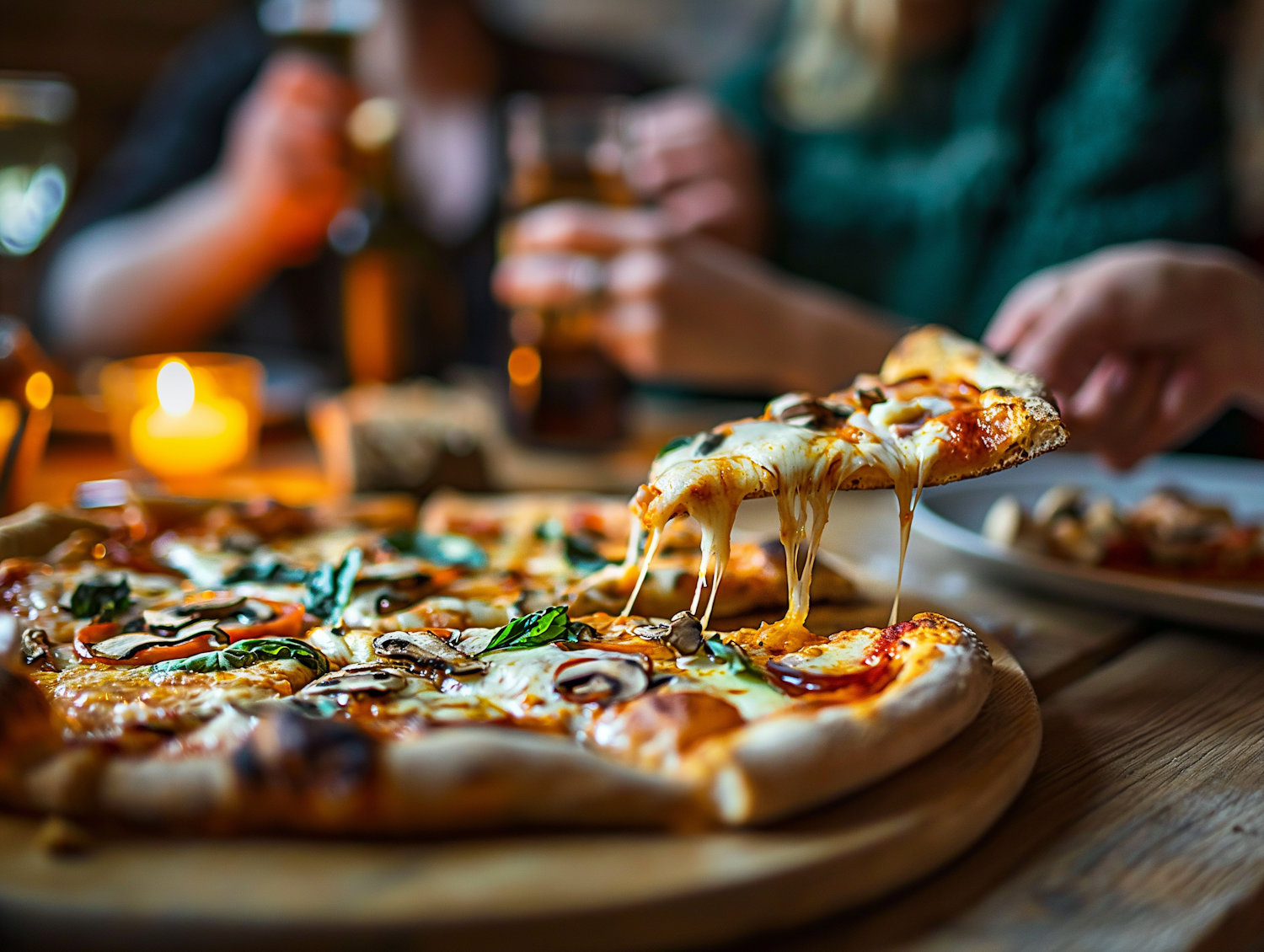 Freshly baked pizza with melted cheese, mushrooms, and basil, served in a cozy setting with warm lighting and drinks.