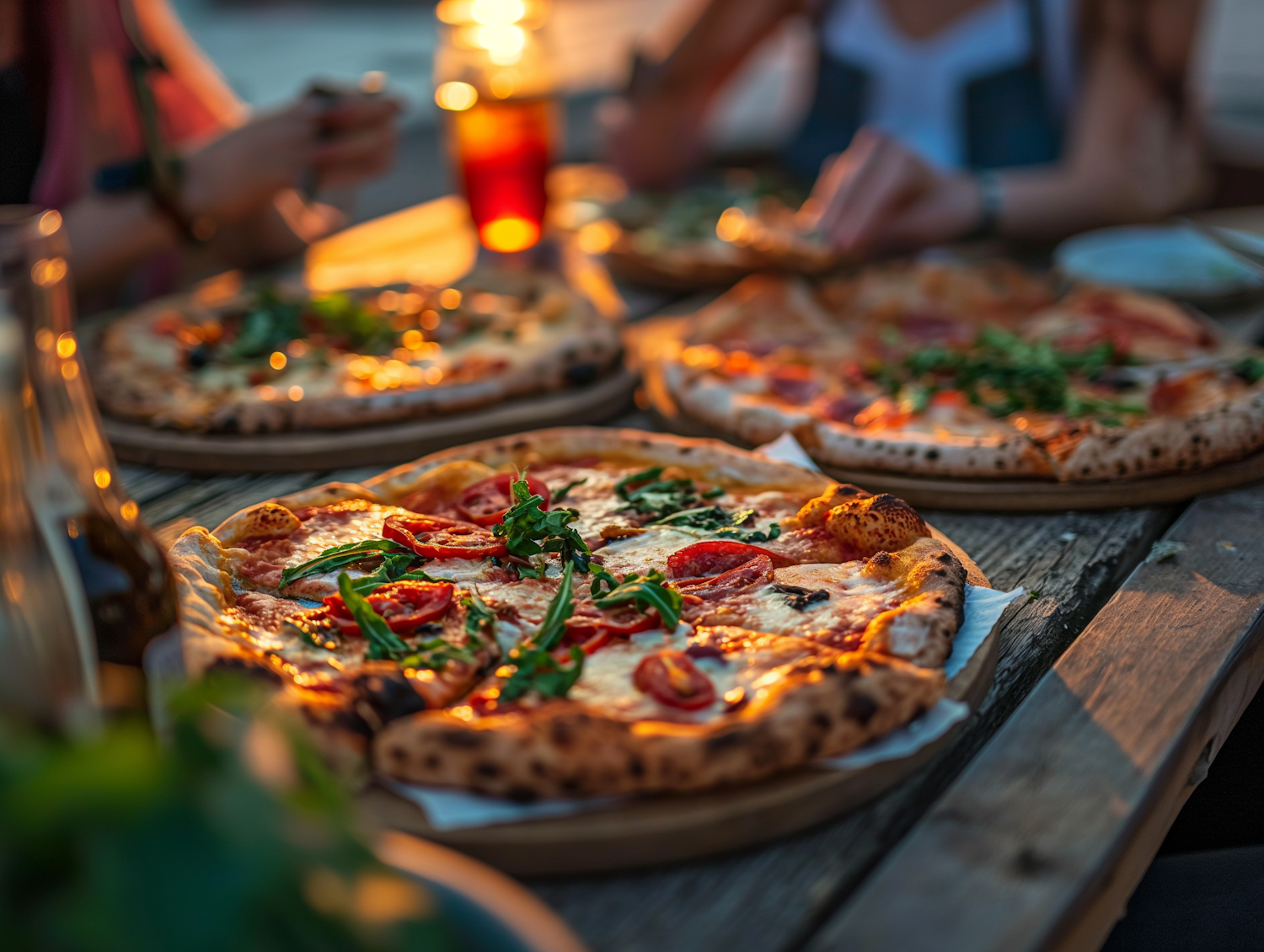 Rustic outdoor dining with delicious pizzas topped with fresh ingredients, set in warm candlelight ambiance.