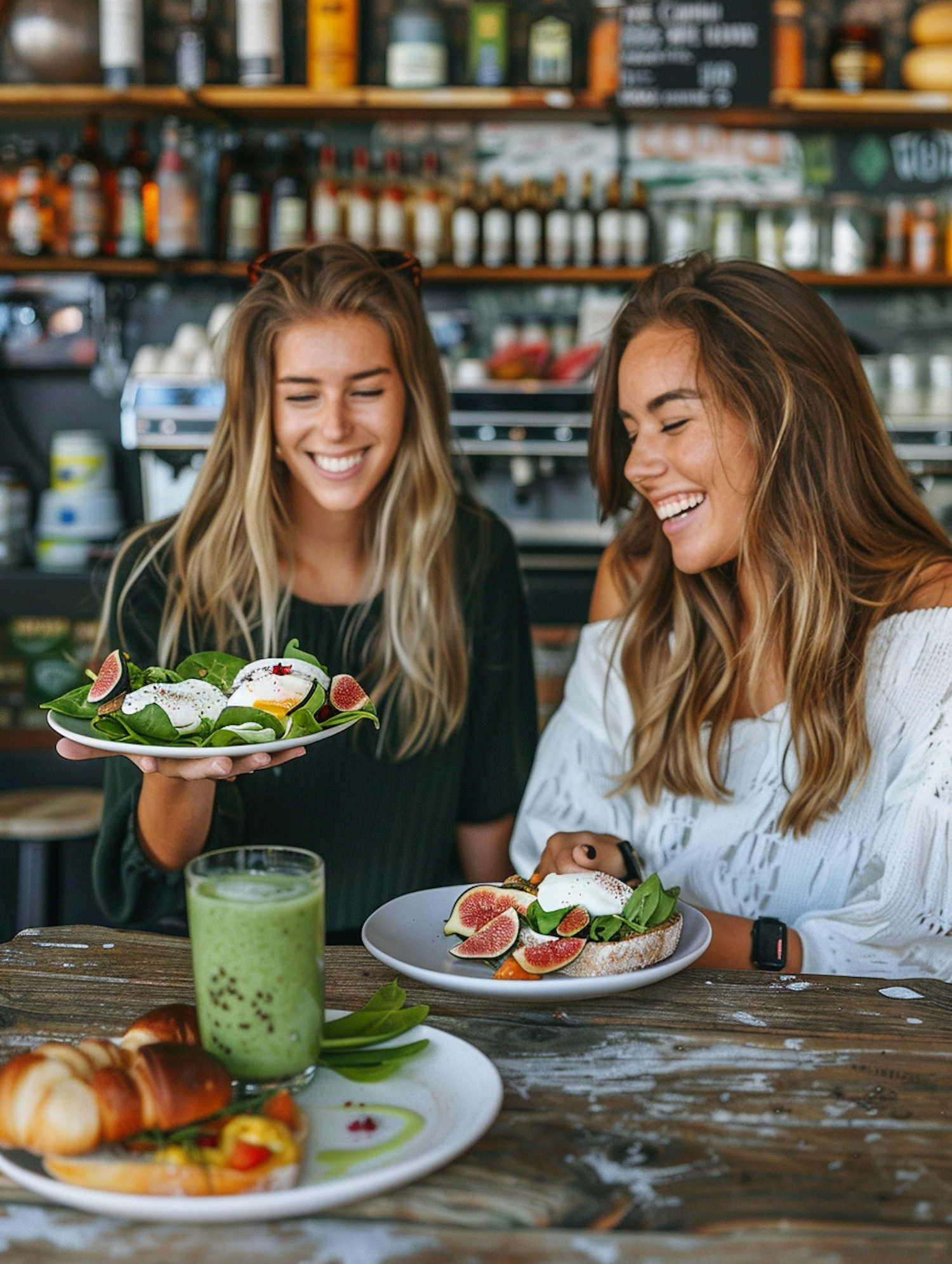 Two women enjoying a healthy meal with salads and smoothies in a cozy café setting, surrounded by a warm and inviting atmosphere.