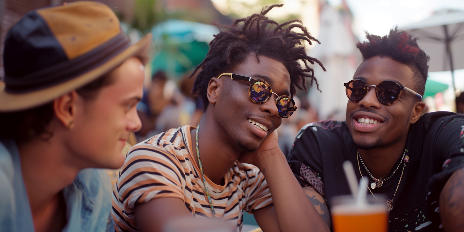 Three friends enjoying a sunny day outdoors, wearing stylish sunglasses and casual attire, sharing smiles and laughter.