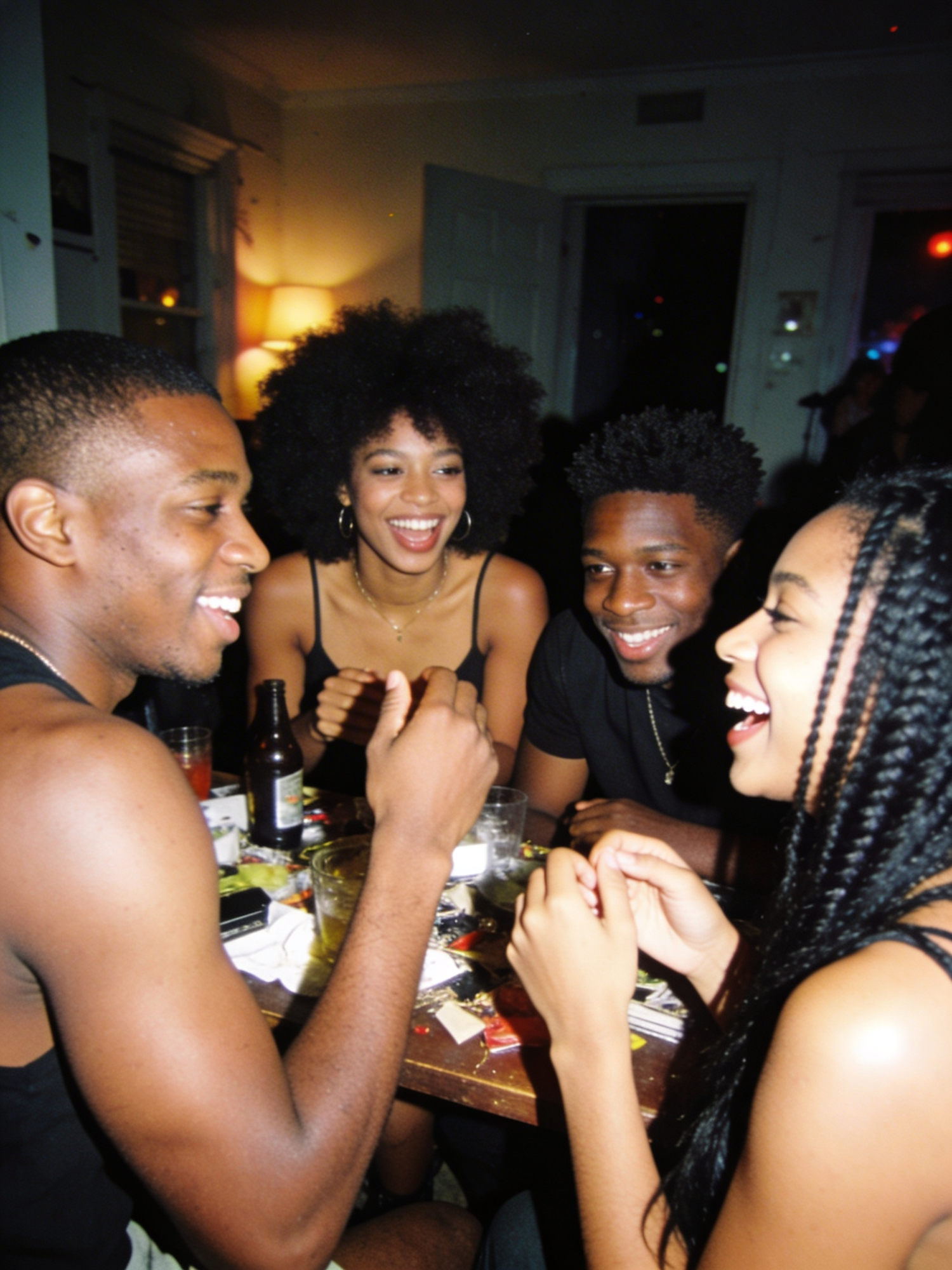 small group of friends sitting around a table inside a house party talking and laughing a Black man with short hair a black woman with an afro an black man with a short afro a black woman with black braids Shot on an early 2000s digital point-and-shoot camera, harsh direct on-camera flash, 24mm wide angle lens very close to subjects, dark apartment environment with warm lighting background, faces brightly illuminated by flash while background fades into darkness, slightly overexposed skin tones, high ISO grain, digital noise, subtle motion blur, imperfect framing, documentary nightlife photography, 2000s disposable camera aesthetic, snapshot photography, raw party atmosphere