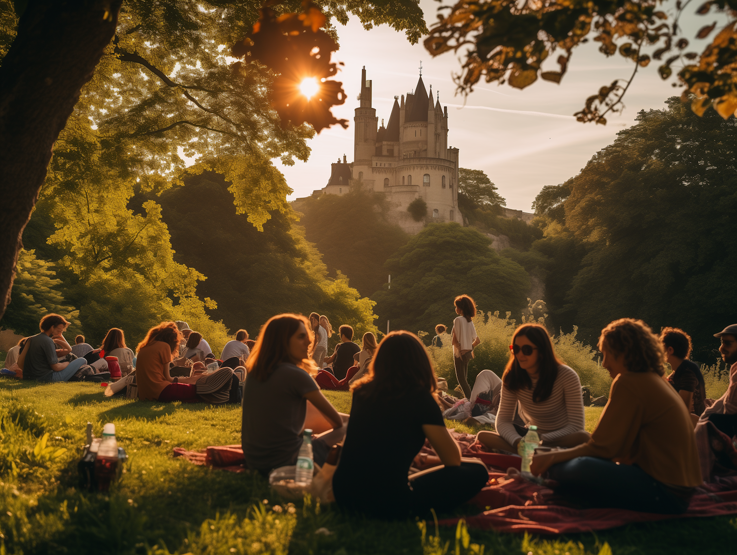 People enjoying a sunny day in a park with a castle in the background, surrounded by lush greenery and warm sunlight.