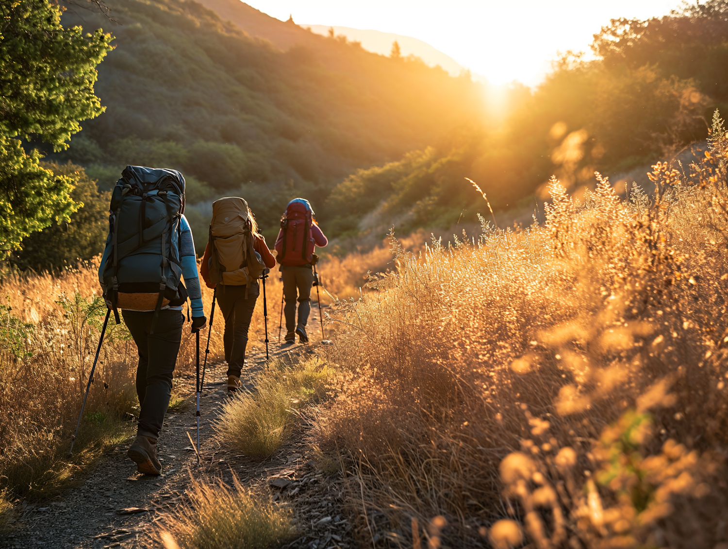 Three hikers trek through a sunlit trail, surrounded by golden grass and hills, with backpacks and trekking poles at sunset.