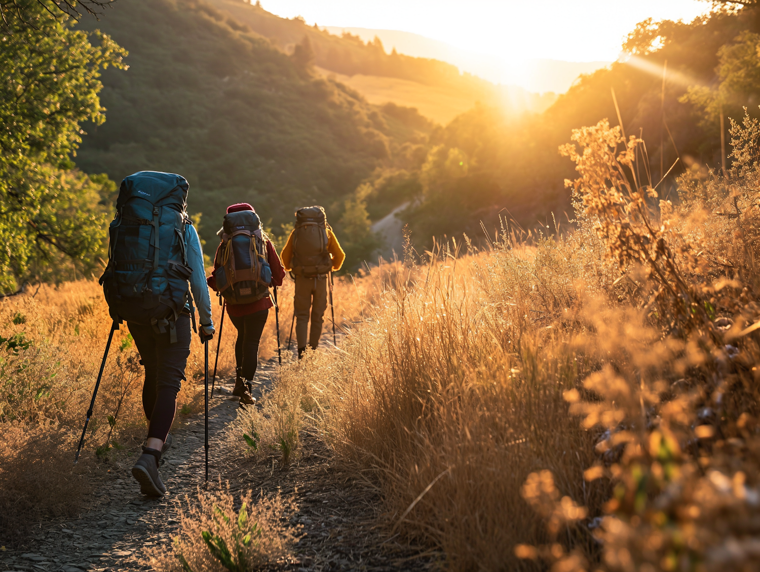 Three hikers trek through a sunlit trail surrounded by golden grass, with a beautiful sunset in the background.