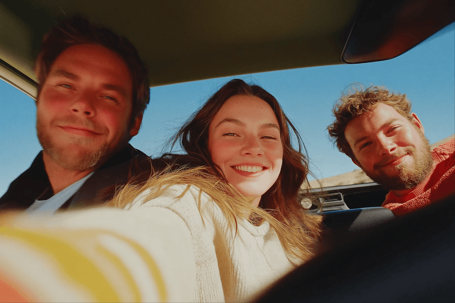 Three friends smiling in a car under a clear blue sky, capturing a joyful moment of friendship and adventure.