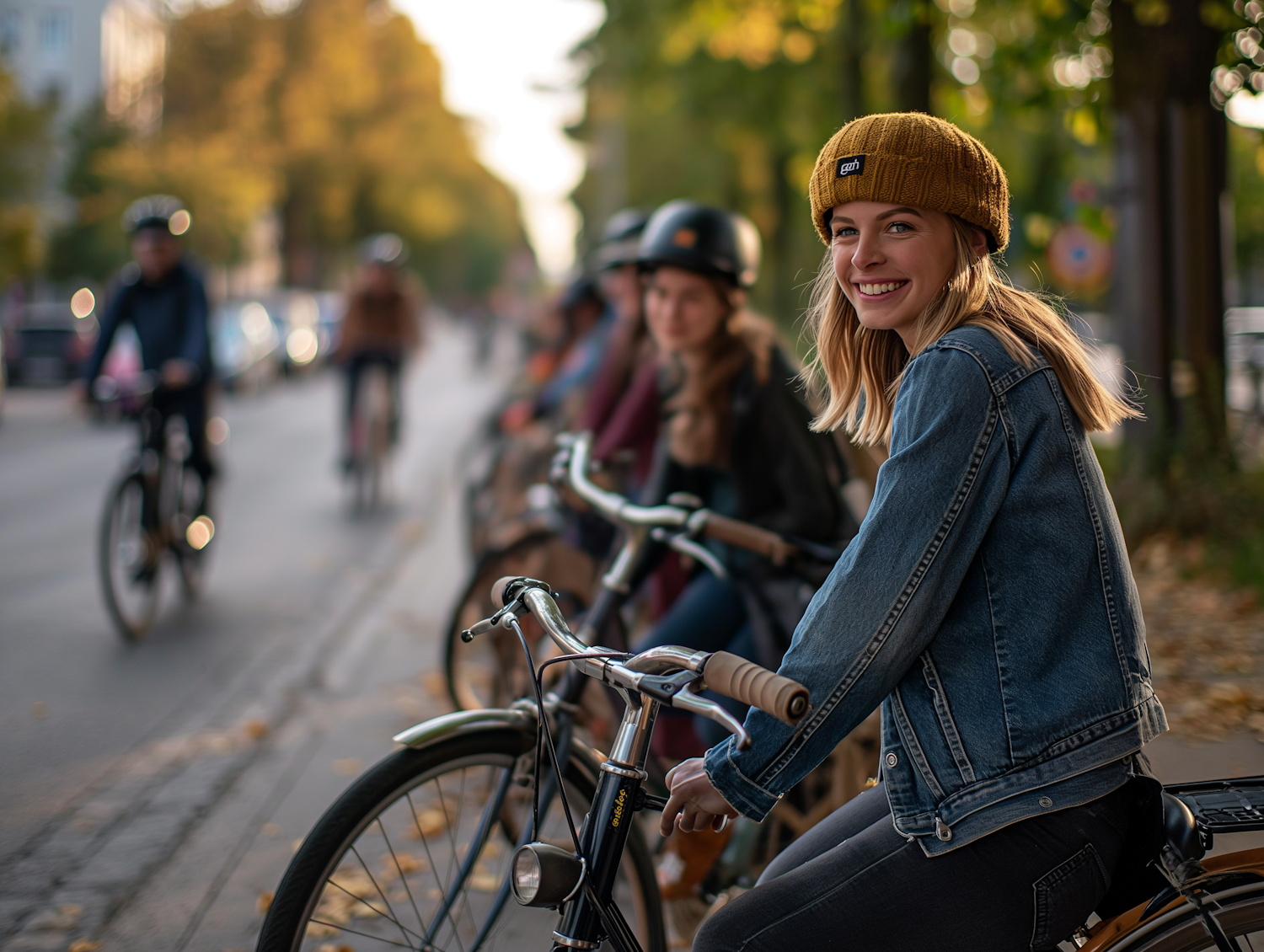 Smiling woman in a yellow beanie rides a bike on a sunny street, surrounded by fellow cyclists in a warm, golden light.