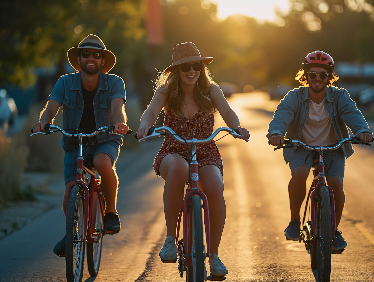 Three friends enjoy a sunny bike ride, wearing hats and sunglasses, with a warm sunset glow enhancing the joyful scene.