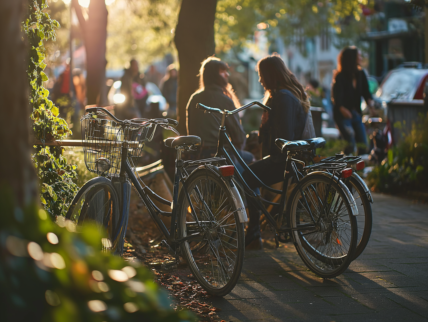 Sunlit bicycles parked on a path with people conversing nearby, creating a warm, relaxed atmosphere in a park-like setting.