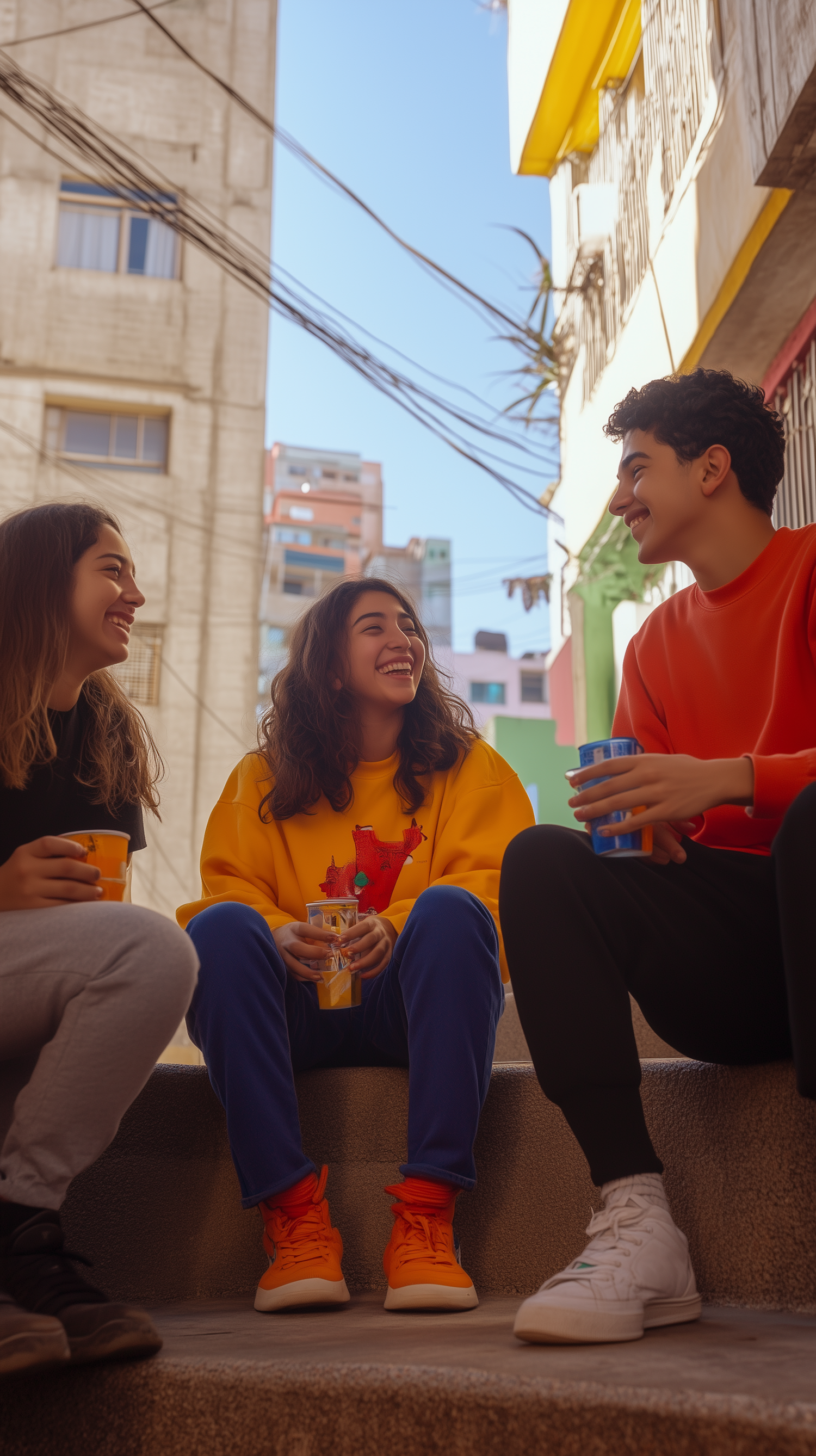 Three friends enjoy a lively chat on urban steps, wearing colorful outfits and holding drinks, with a cityscape backdrop.