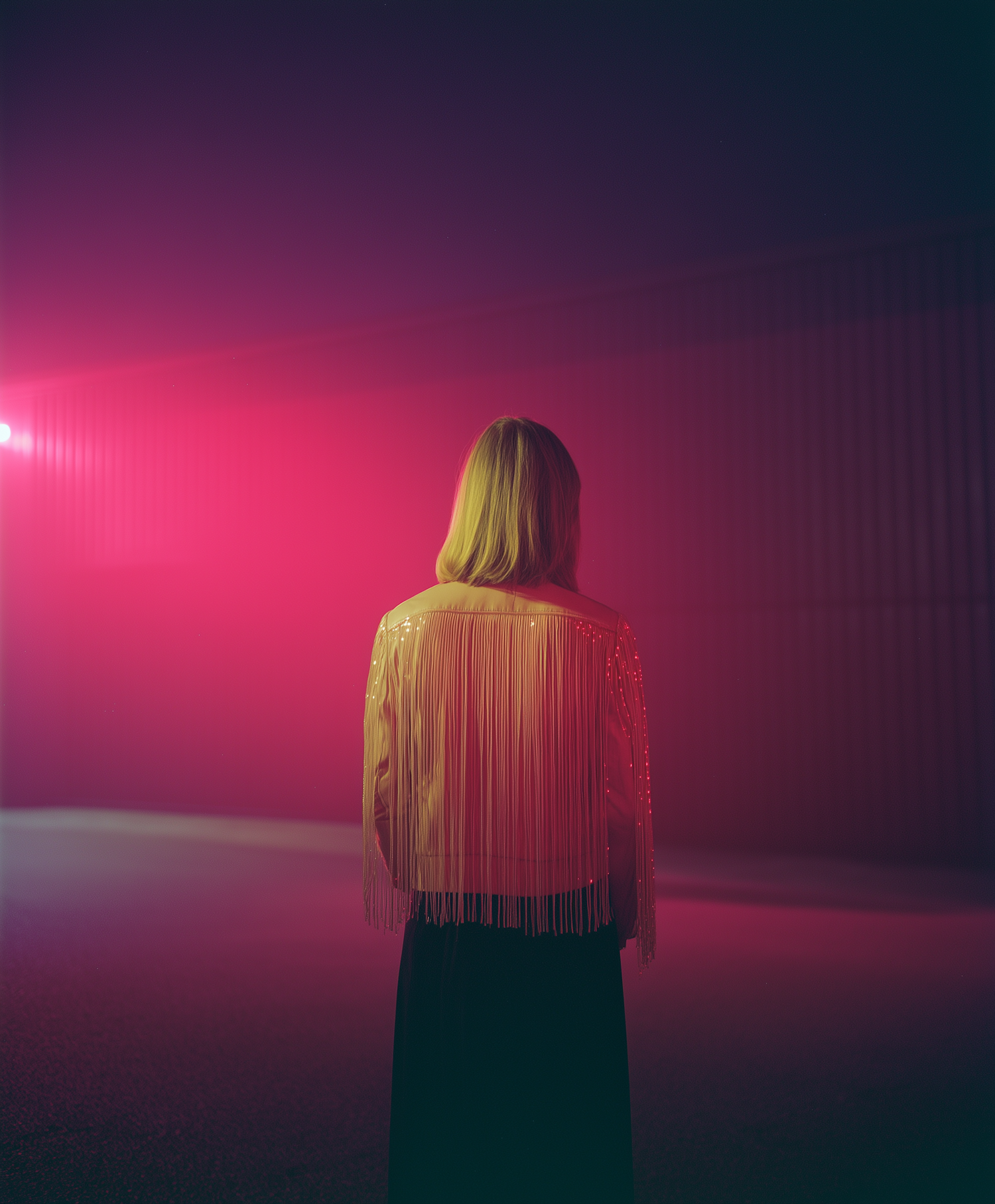 A moody shot of a person in a fringed jacket, bathed in pink and purple light, creating a dreamy, atmospheric vibe.