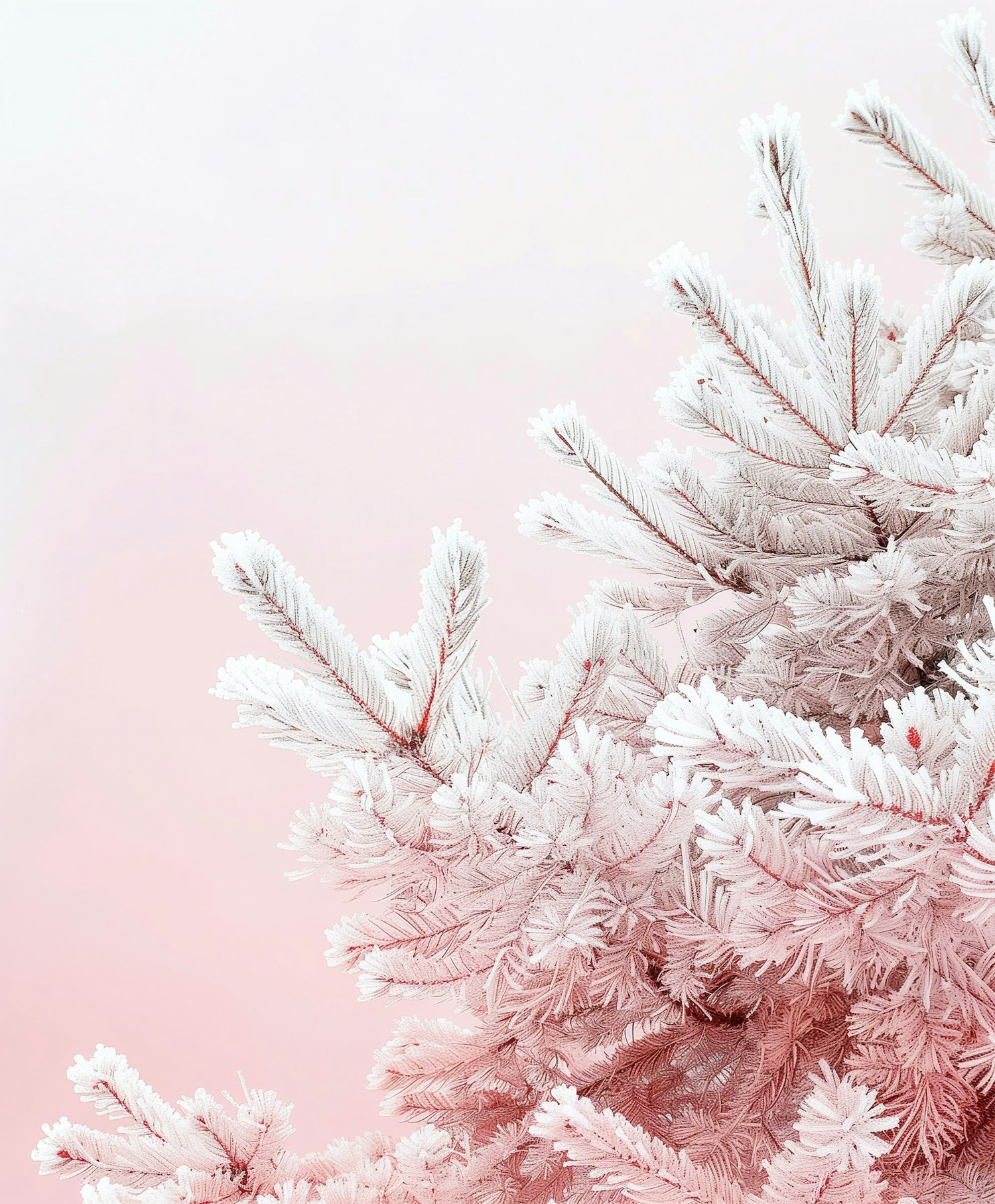 Frost-covered pine branches against a soft pink background, creating a serene winter scene with delicate textures and contrasts.