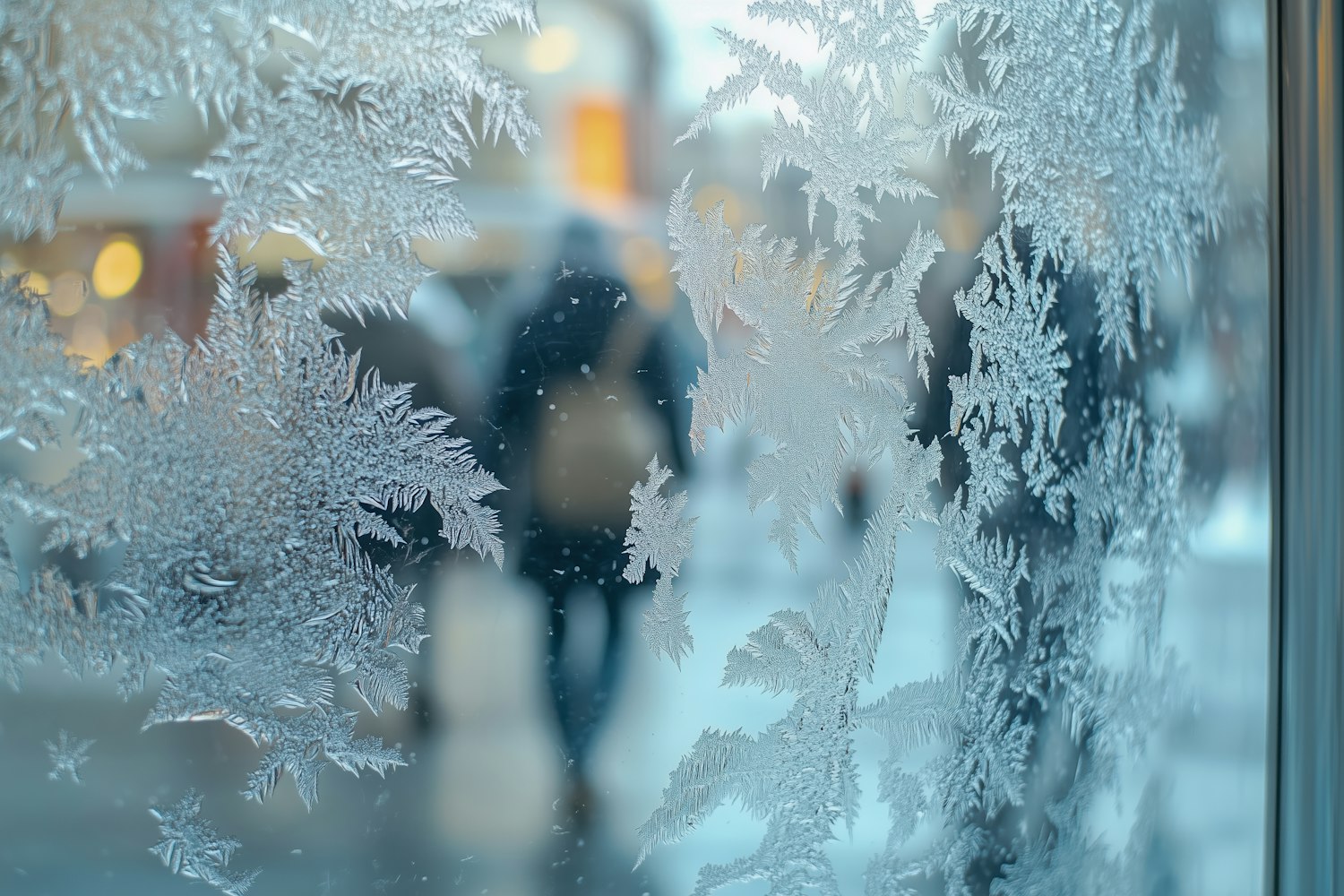 Intricate frost patterns on a window with blurred silhouettes of people outside, creating a wintry, artistic scene.