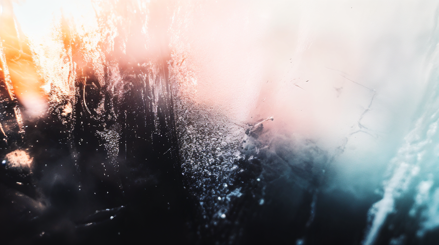 Abstract close-up of frosted glass with warm orange and cool blue tones blending beautifully, creating a dynamic and textured visual.