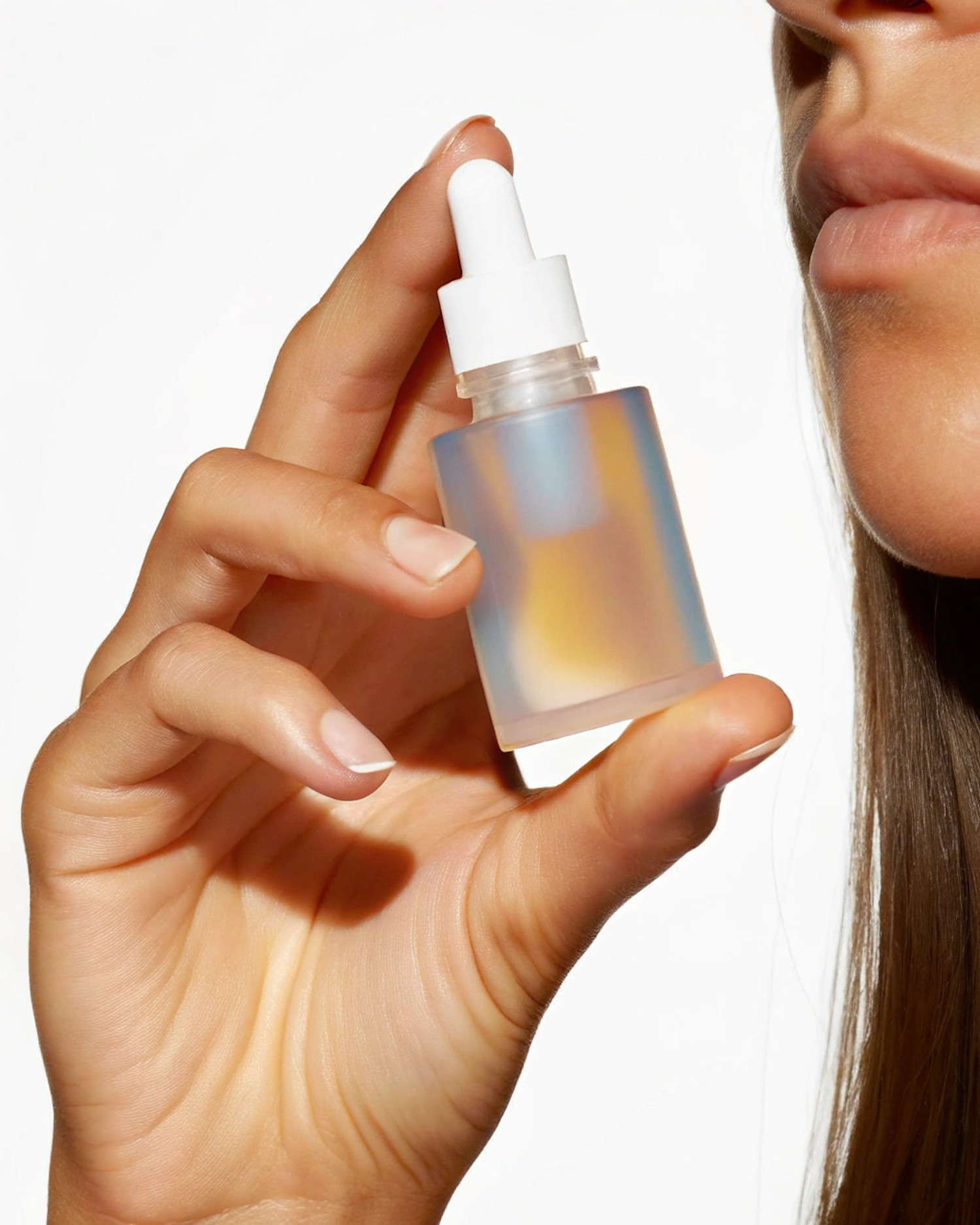 Close-up of a frosted glass dropper bottle with iridescent hues held by a hand, with part of a woman's face in a bright white background.