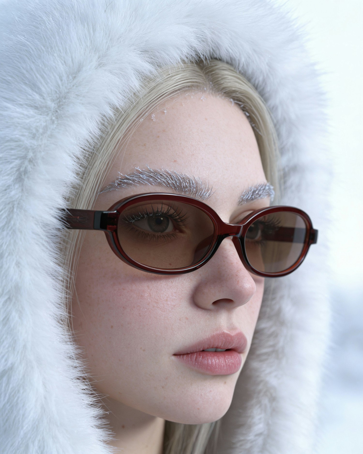 Close-up of a person in a white fur hood with frosted eyebrows and red sunglasses, showcasing a winter aesthetic.