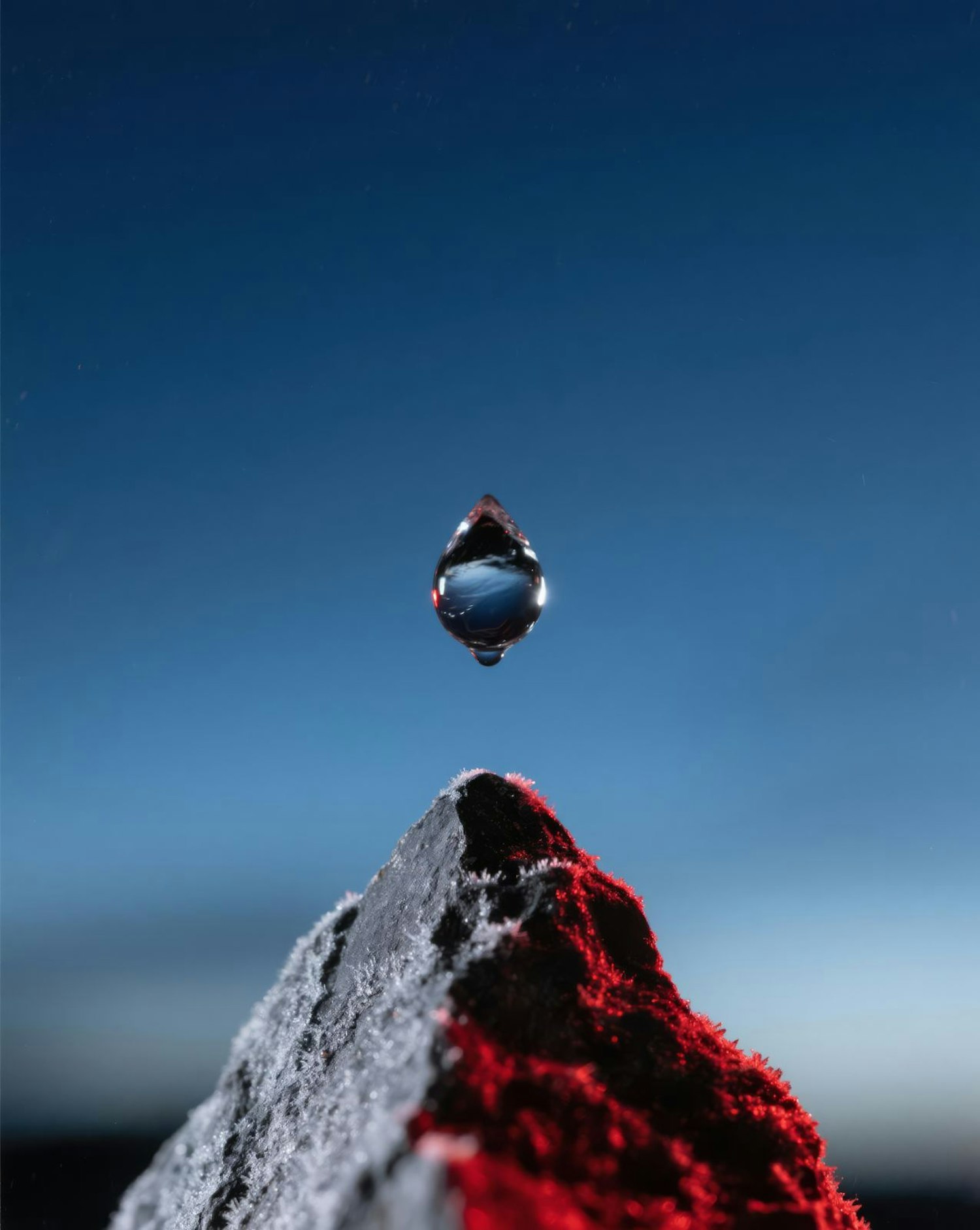 A frosted rock peak with red highlights and a suspended water droplet against a blue sky, creating a surreal and striking visual.