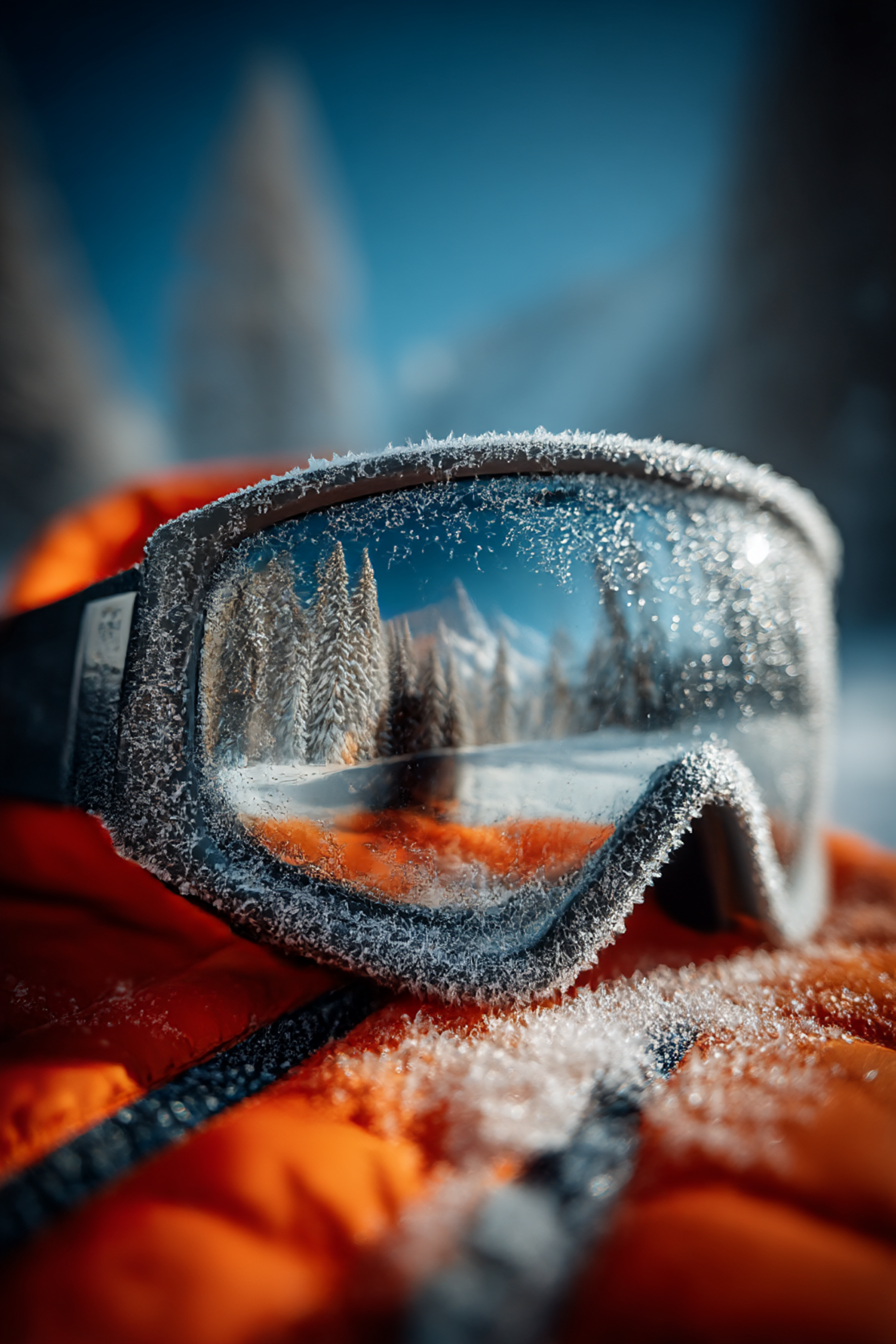 Frosted ski goggles on an orange jacket reflect a snowy forest and blue sky, capturing the essence of a winter adventure.
