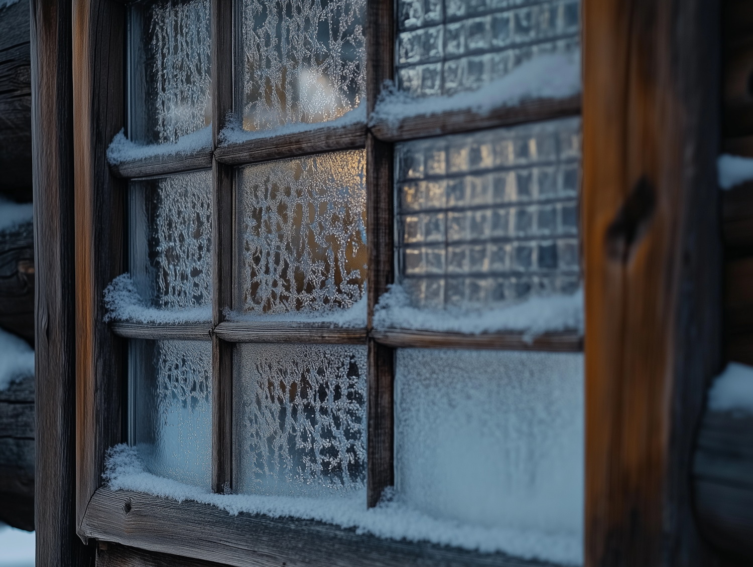Rustic wooden window with frosted glass and snow, creating a cozy winter atmosphere with warm light filtering through.