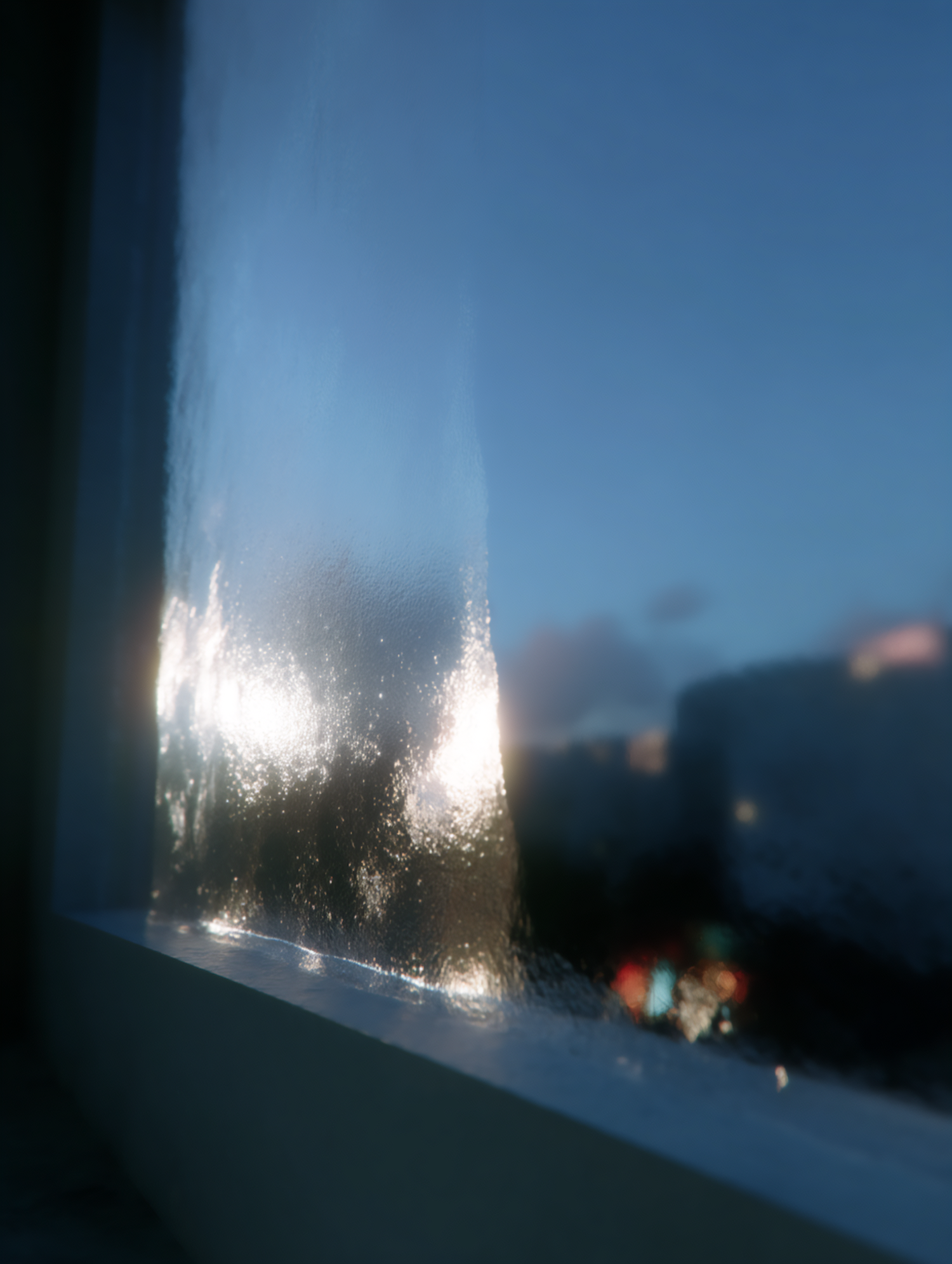 Frosted windowpane reflecting light with a blurred cityscape in the background under a twilight sky. Cool and tranquil tones.