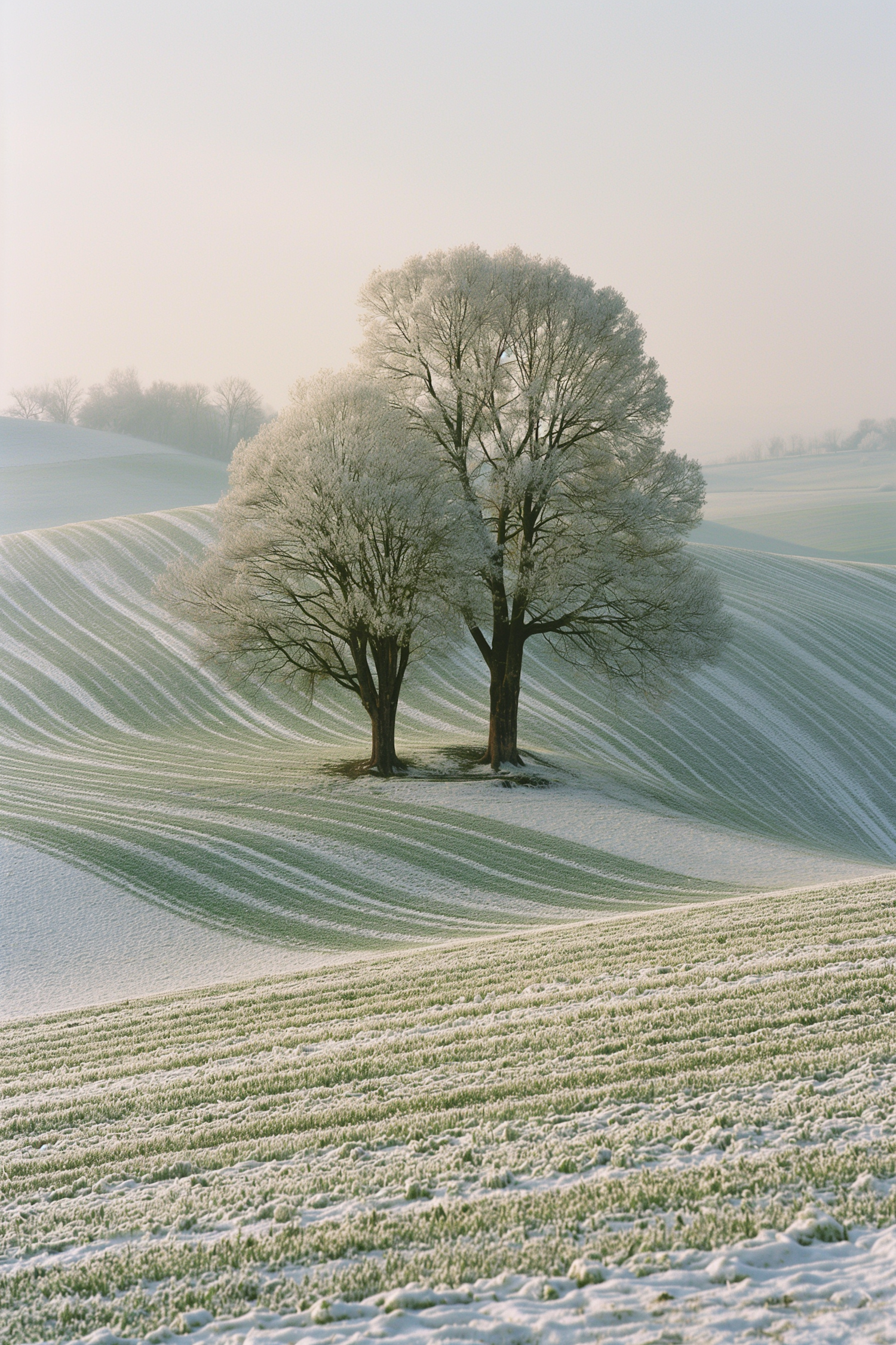 Frost-covered trees on rolling snowy hills create a serene winter landscape with striped fields and a misty horizon.