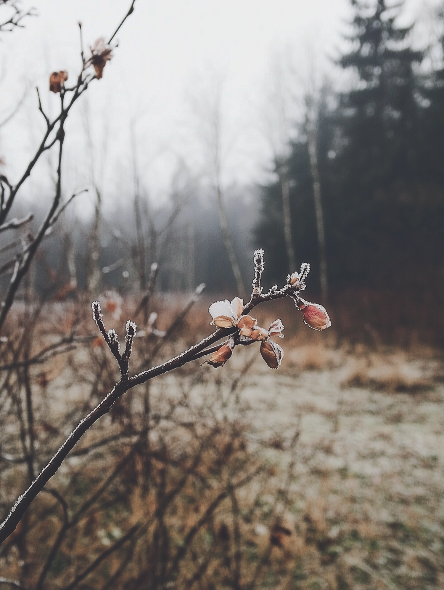 Frost-covered branch with buds in a wintry forest, featuring muted colors and a serene, chilly atmosphere.