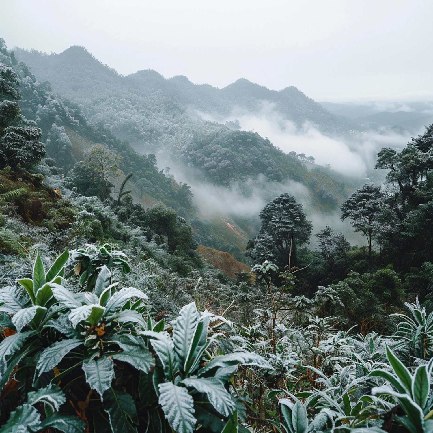 Frost-covered mountain landscape with lush greenery, misty valleys, and serene rolling hills under a cool, tranquil atmosphere.