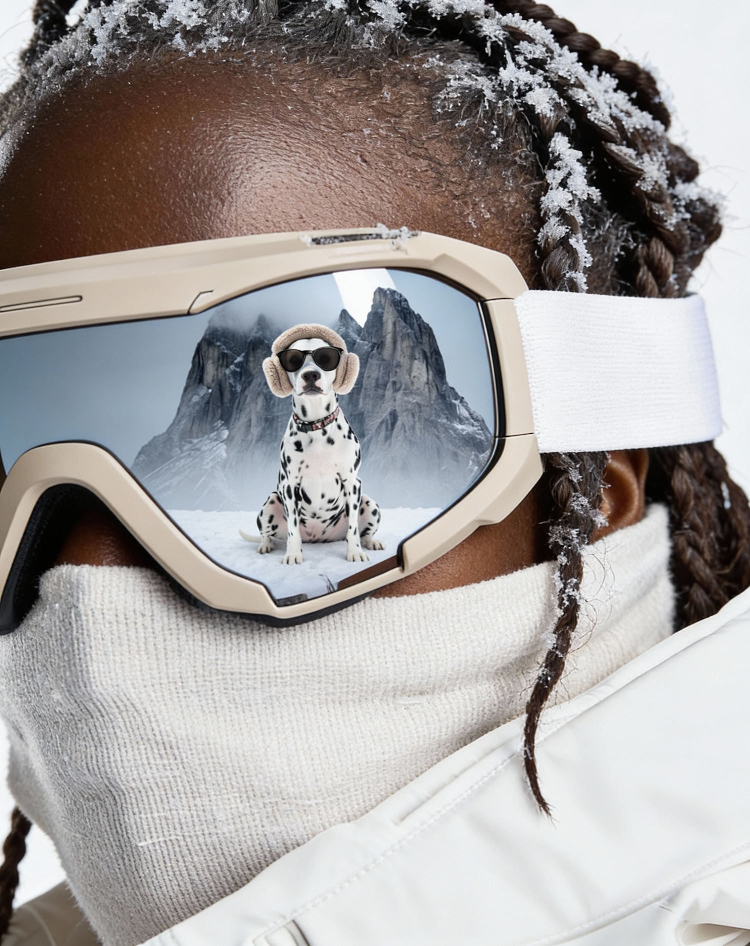 Close-up of a person in ski gear with frosted braids, their goggles reflecting a Dalmatian in earmuffs against a snowy mountain scene.