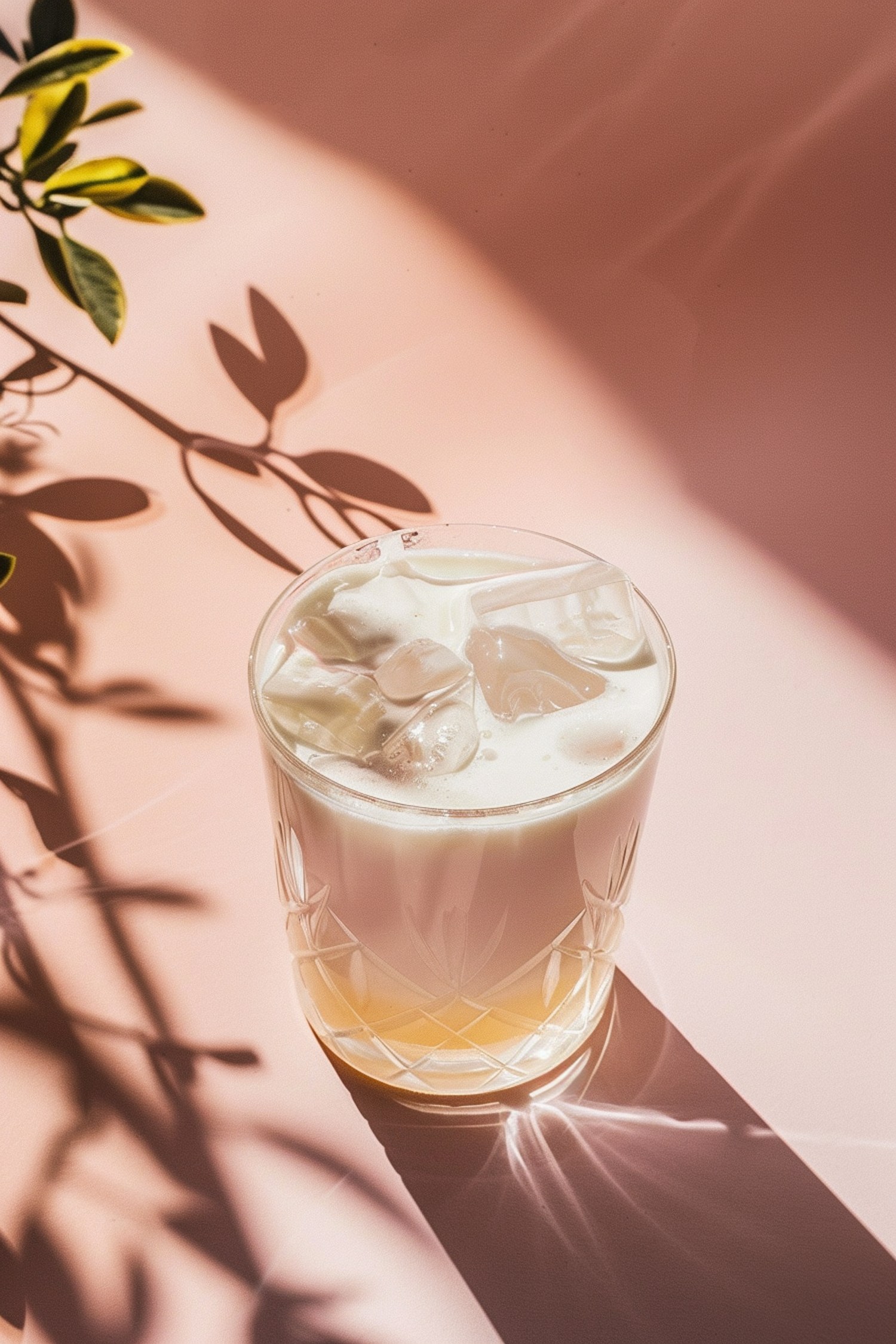 Elegant glass of iced creamy drink on a pink surface with leaf shadows, creating a serene and refreshing atmosphere.
