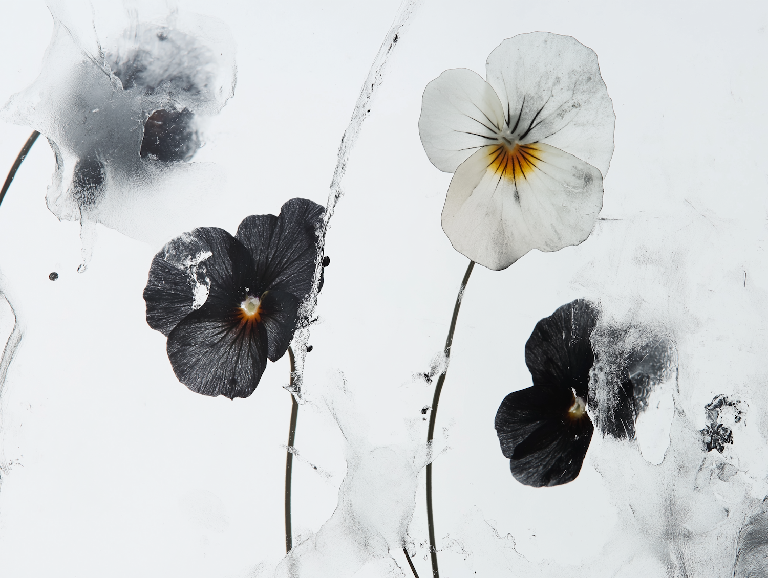 Artistic frozen flowers in ice, showcasing delicate black and white petals with intricate icy patterns.