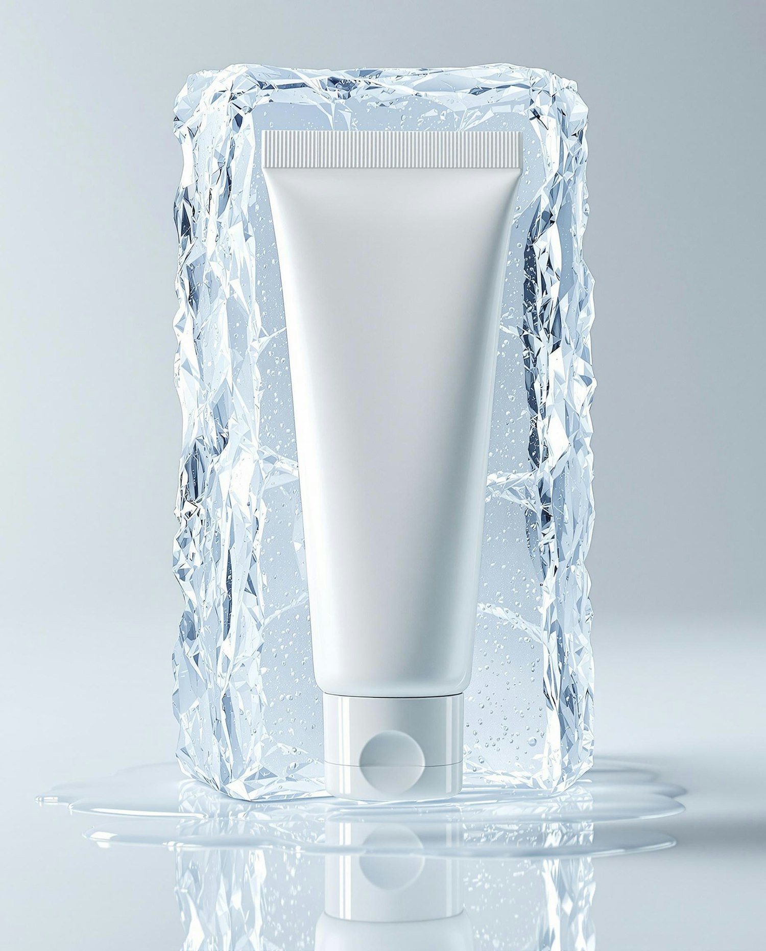 A hyper-stylized mockup of a blank white cosmetic tube partially encased in a semi-transparent melting ice block. Water puddles around the base. The setting is a clean reflective surface, and the light is crisp and cold-toned, emphasizing texture and condensation. The tube is glossy and unbranded.