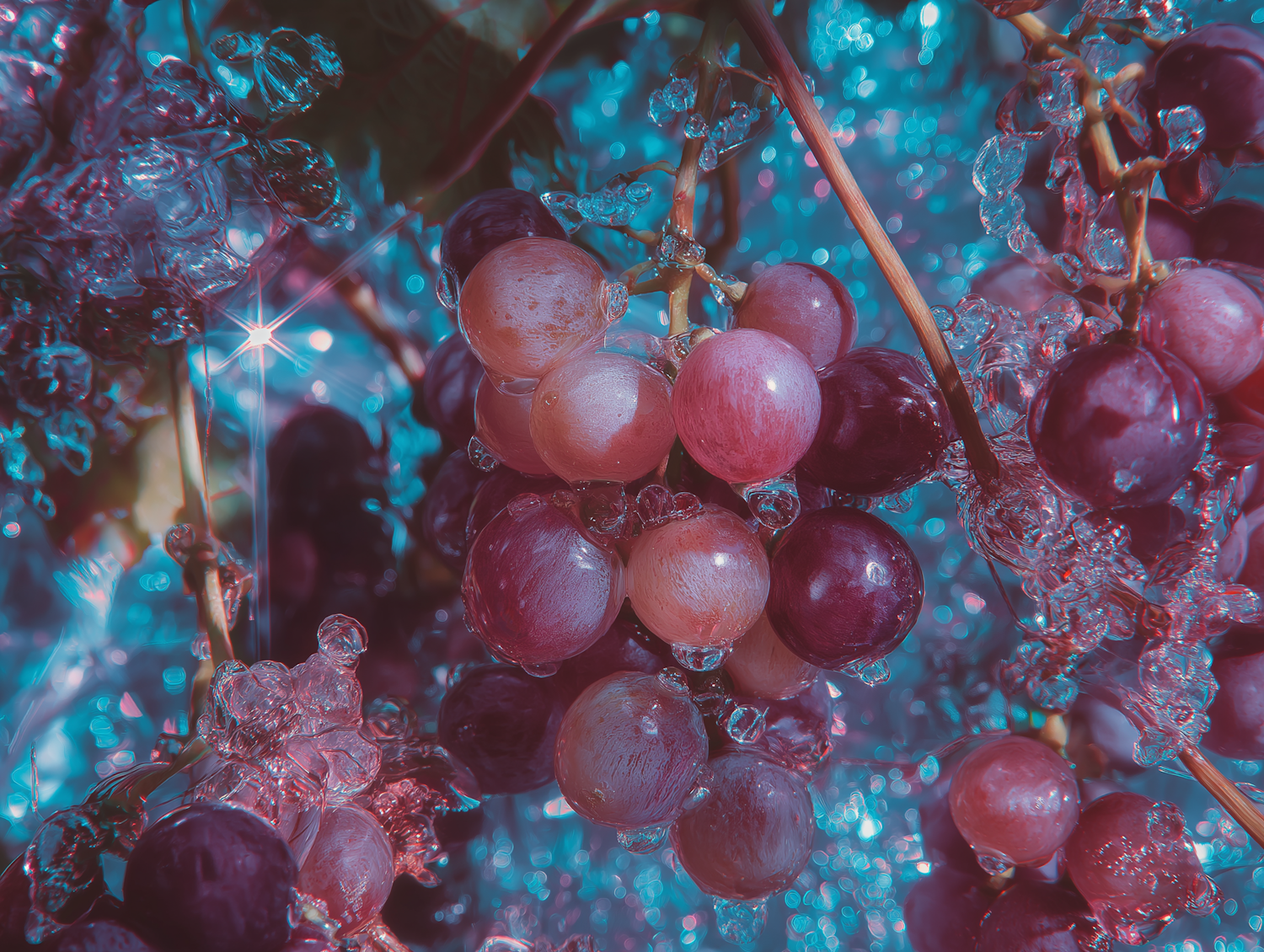 Red grapes surrounded by frost and glittering light in a vibrant blue and purple setting.