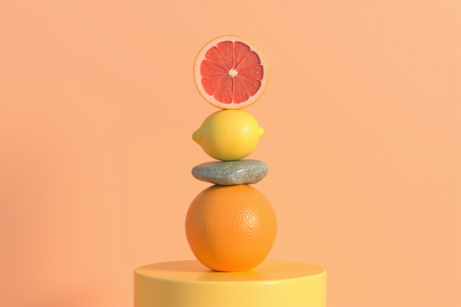 A creative stack of a grapefruit slice, lemon, stone, and orange on a yellow pedestal against a peach background.
