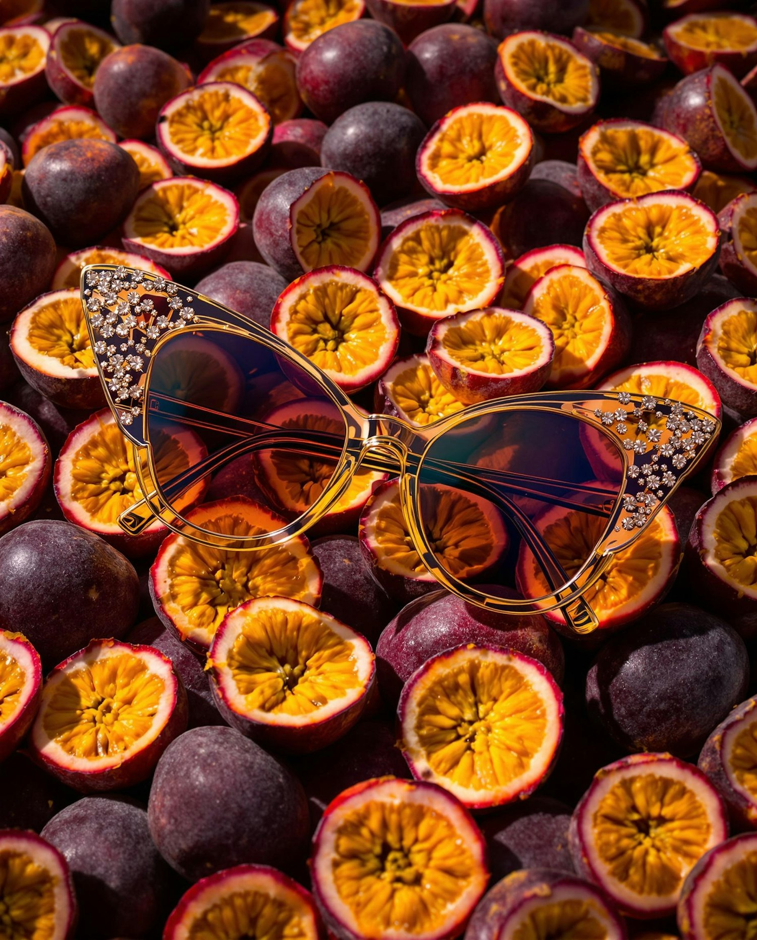Stylish cat-eye sunglasses with amber lenses rest on a breathtaking bed of vibrant halved passion fruits, creating an artistic vivid scene.