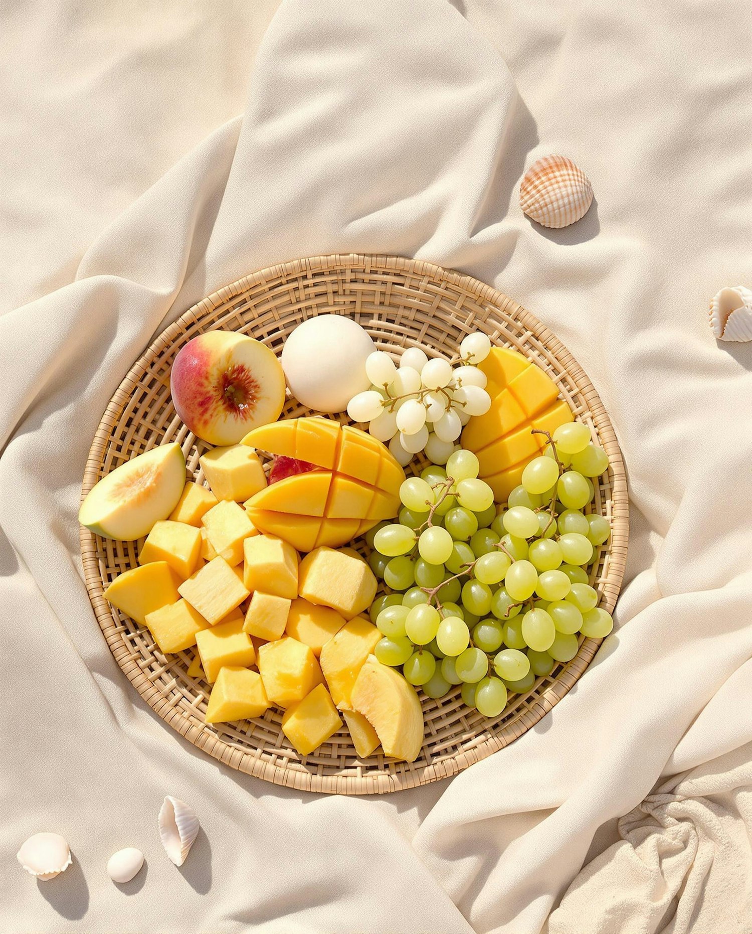 A soft and sunny beach still life with a light beige fabric spread on warm sand, holding a round rattan tray filled with freshly cut mango slices, white peaches, and green grapes. Gentle morning shadows and seashells scattered nearby. Shot in soft, diffused natural light with pale tones and a tranquil holiday feeling.