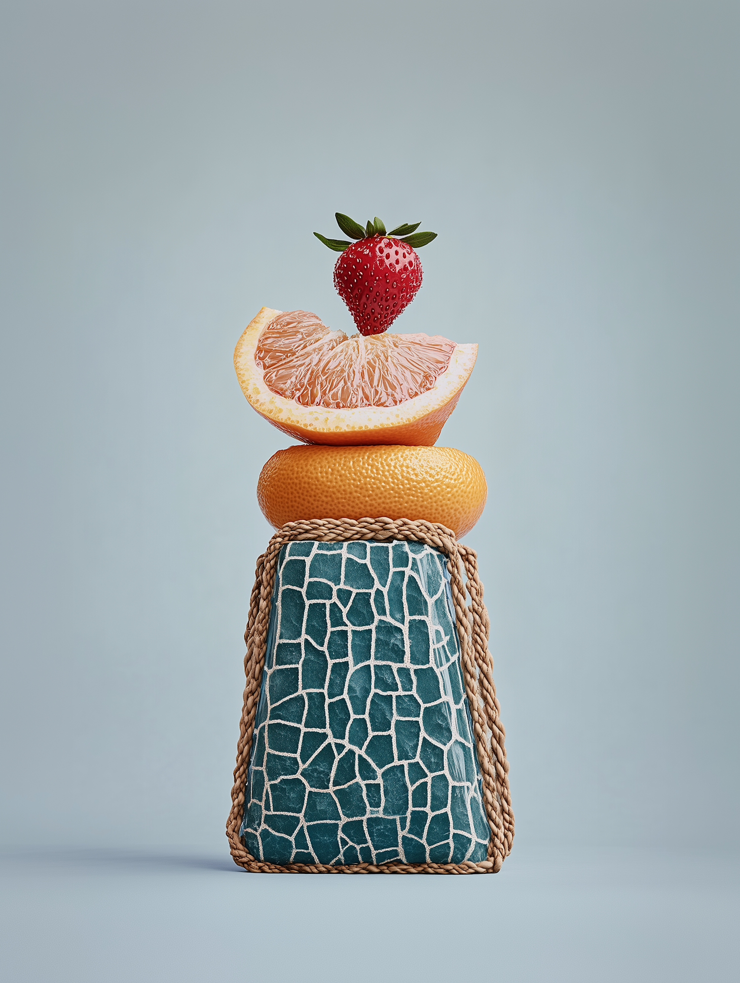 Artistic fruit stack with a strawberry, grapefruit slice, and orange on a textured teal base. Vibrant colors and playful composition.