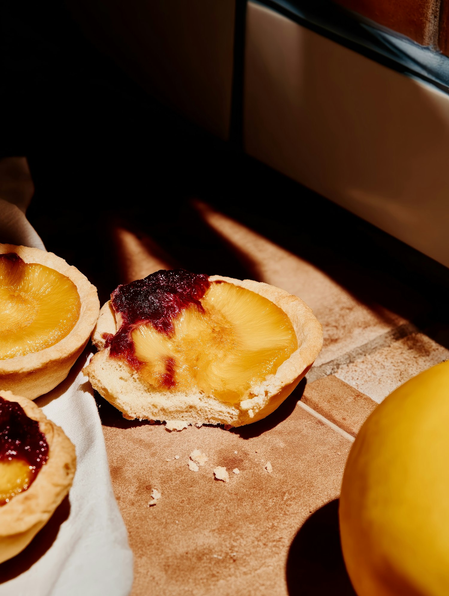 Golden fruit tarts with pineapple and jam on a tiled surface, one partially eaten, with warm lighting and a yellow fruit in the foreground.