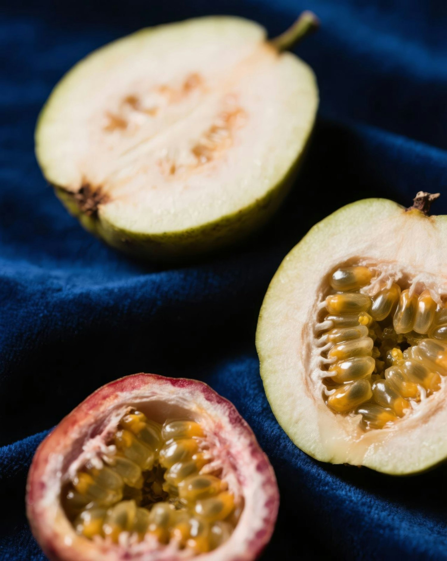 Close-up of halved guava and passion fruit on a dark blue fabric, showcasing vibrant colors and textures in a striking composition.