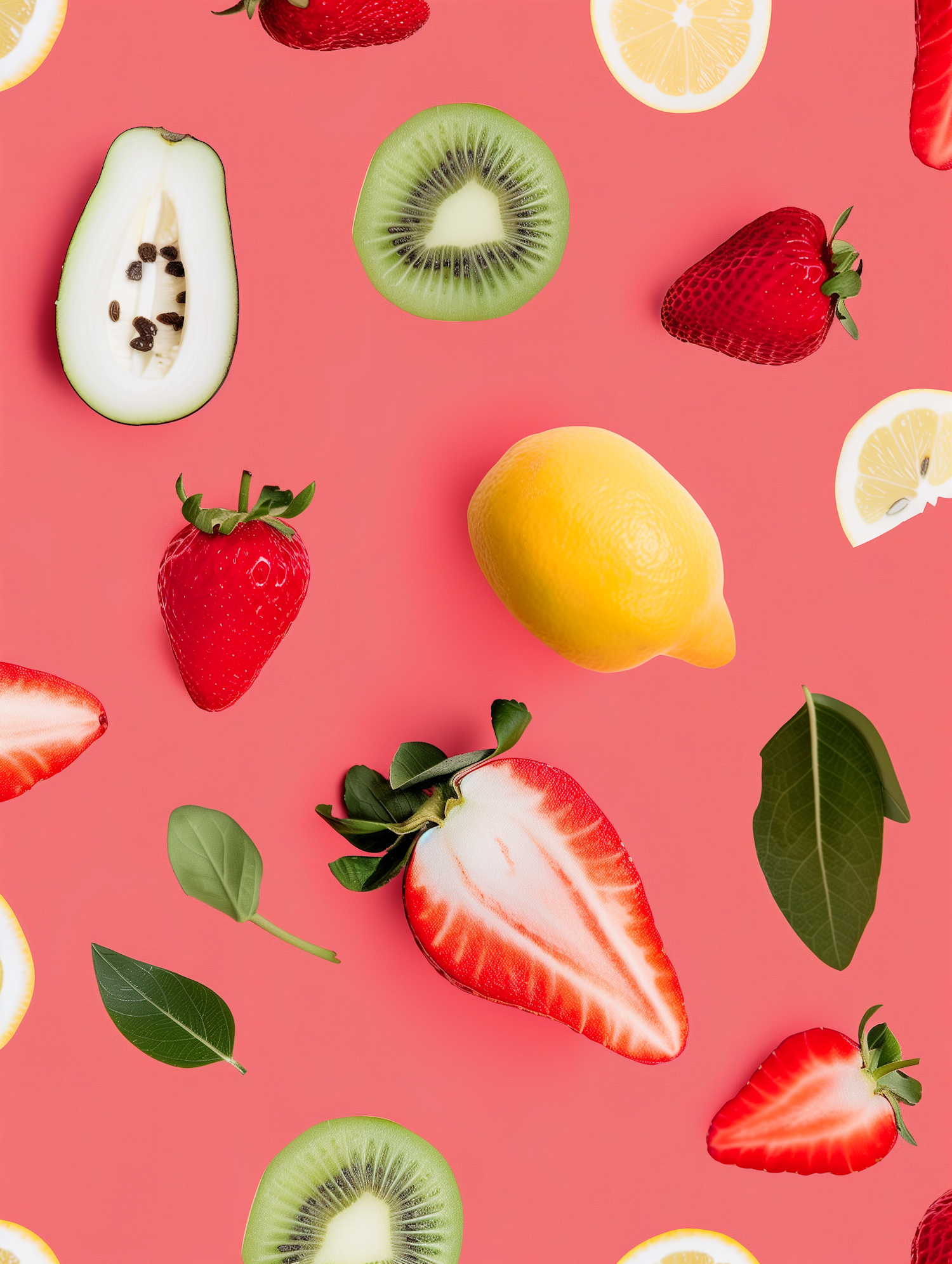 Bright flat-lay of strawberries, kiwi, lemon, avocado, and green leaves on a coral pink background. Perfect for fresh, vibrant vibes.