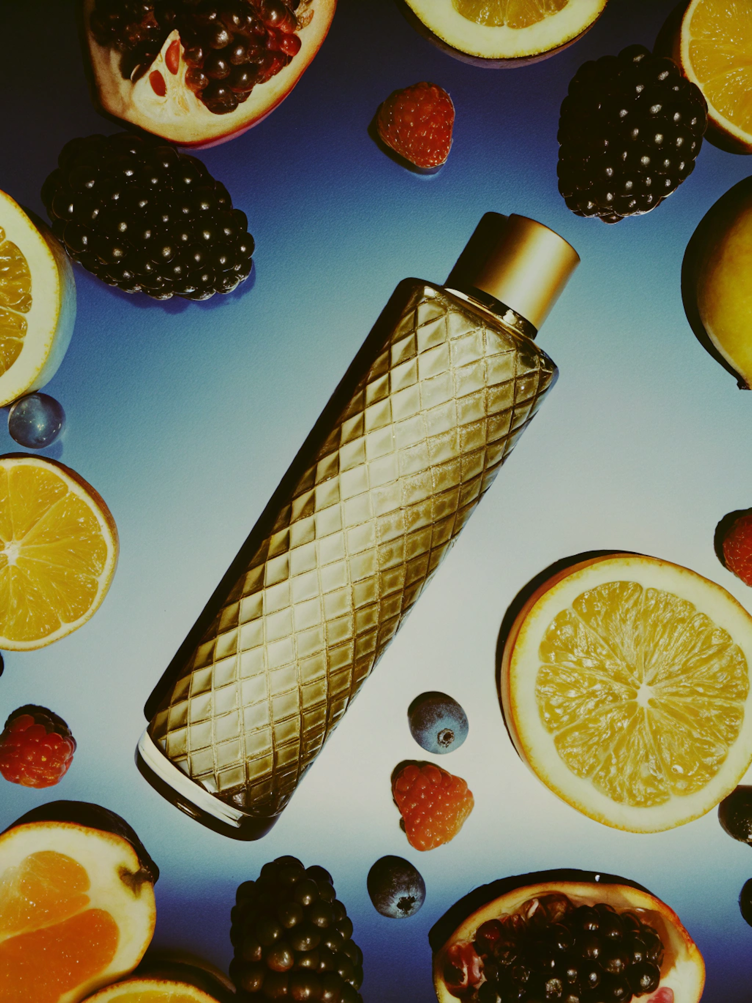 Gold diamond-patterned perfume bottle surrounded by vibrant fruits like oranges, berries, and pomegranate on a blue gradient background.
