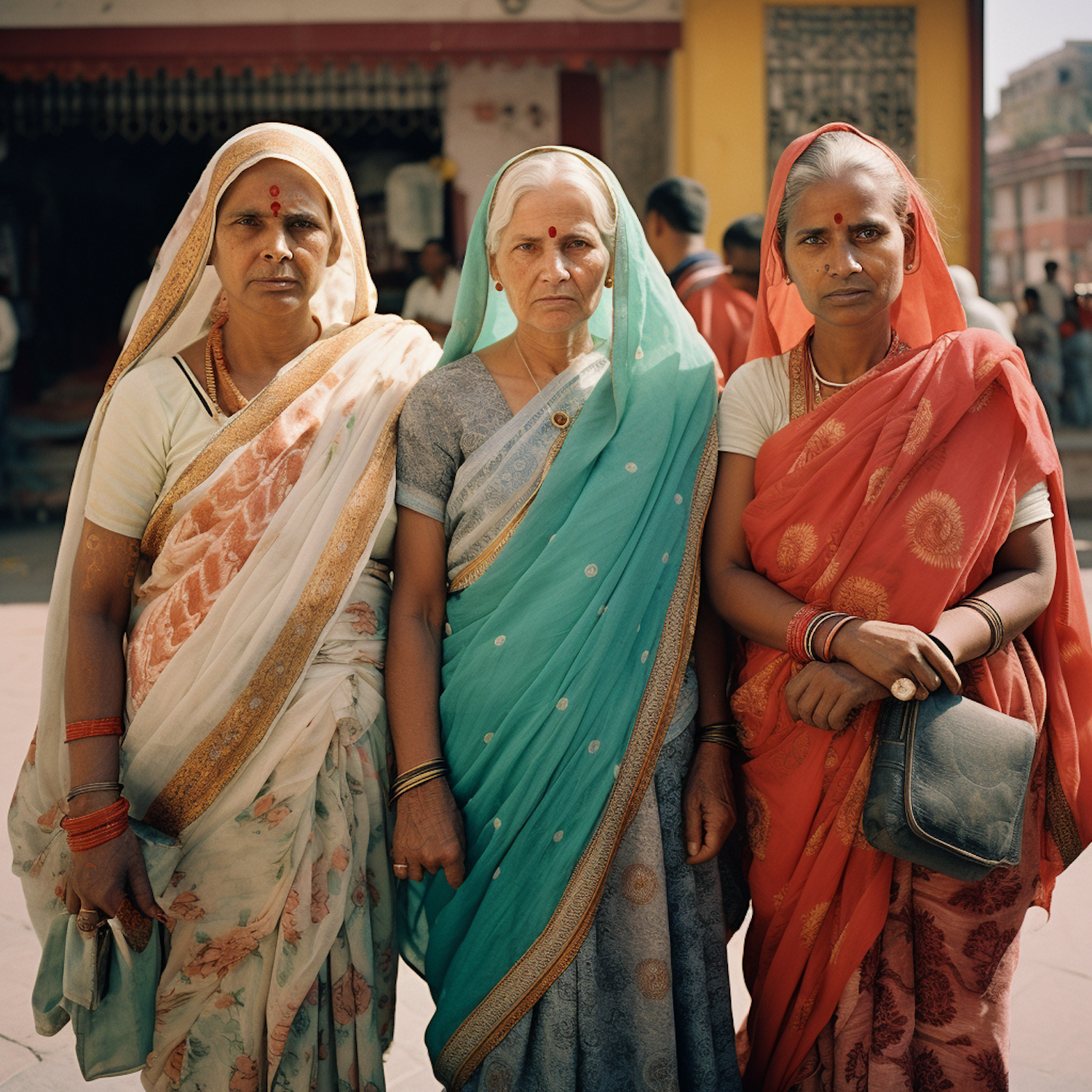 Three elderly Indian women in colorful sarees stand together, showcasing traditional attire and cultural elegance.