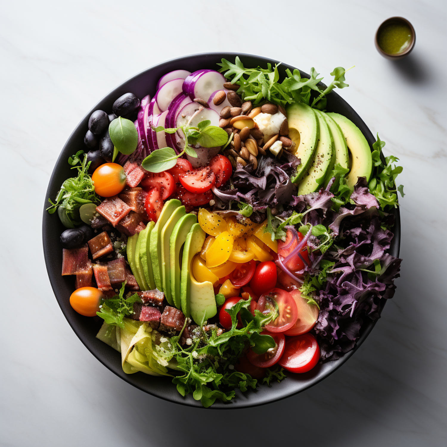 Colorful salad with avocado, cherry tomatoes, bell peppers, and mixed greens in a black bowl, accompanied by a green dressing.