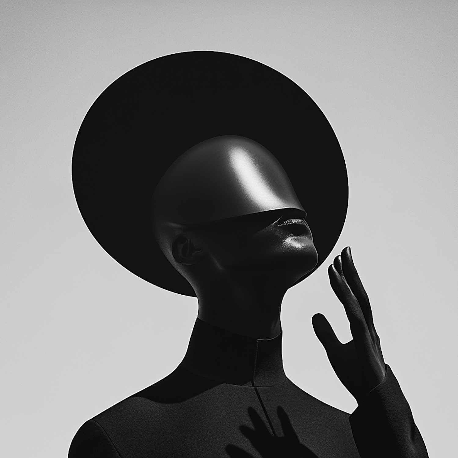 Abstract mannequin with a featureless face, wearing a black outfit and halo, casting dramatic shadows in a monochromatic setting.
