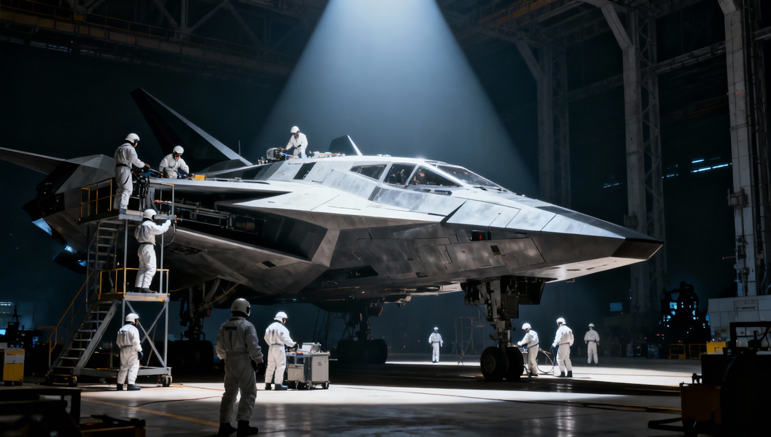A futuristic aircraft in a hangar with technicians in white suits performing maintenance under focused lighting.